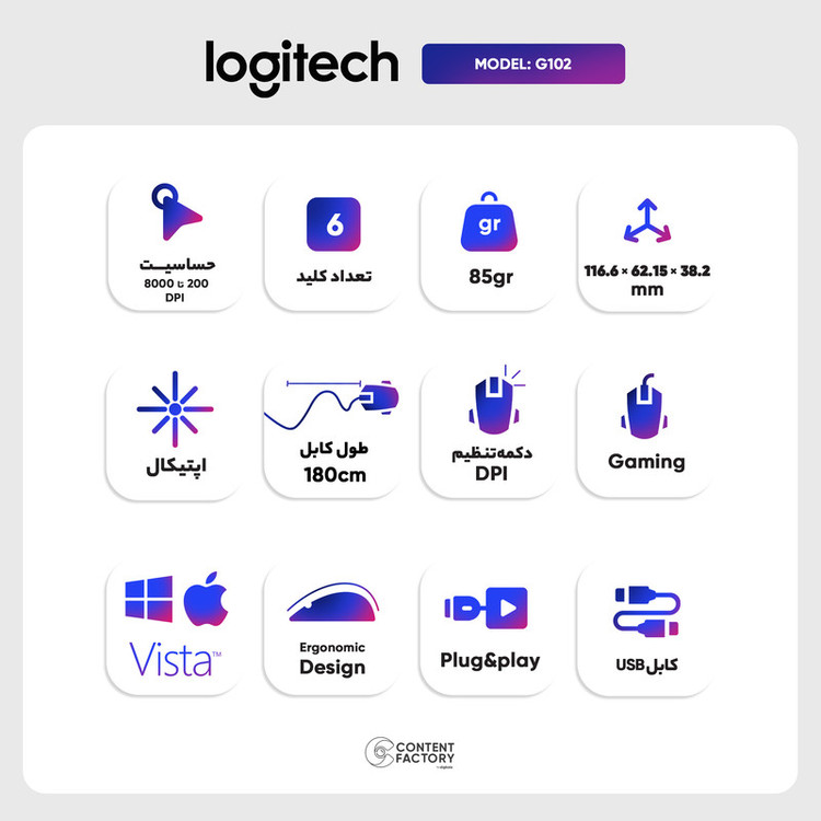 ماوس G102 محصولی از برند «لاجیتک» (Logitech) است. این محصول برای استفادهی علاقهمندان به بازی و گیمرها ساخته شده است. بنابراین، دقت بالایی در زمان استفاده دارد؛ بهطوریکه، میتوان دقت آن را بین 200 تا 8000 نقطه بر اینچ تنظیم کرد که میزان بسیار مطلوبی است. ماوس G102 از طریق کابل و USB به کامپیوتر متصل میشود و کاربر را در انجام بازی یاری میدهد. لاجیتک این ماوس را برای افراد راستدست طراحی کرده است. این نکته را میتوان از شکل قرارگیری و محل قرارگیری کلیدها حدس زد. این ماوس برند لاجیتک دارای کابلی بلند است که در زمان کار با ماوس بسیار کاربردی ظاهر میشود. داشتن حافظه داخلی و سرعت پیگیری اطلاعات 1 میلیثانیه ارزش خرید بالایی به این محصول دادهاند. از دیگر ویژگیهایی که باید به آن اشاره کرد عمر بالای قطعات این محصول است. گذشته از این، نورهای RGB هم در این ماوس وجود دارند تا نظر گیمرها را هم بیش از پیش به خود جلب کنند. پس اگر به دنبال ماوسی کاربردی و ارزشمند برای بازی هستید، این ماوس لاجیتک را به عنوان محصولی کاربردی درنظر داشته باشید