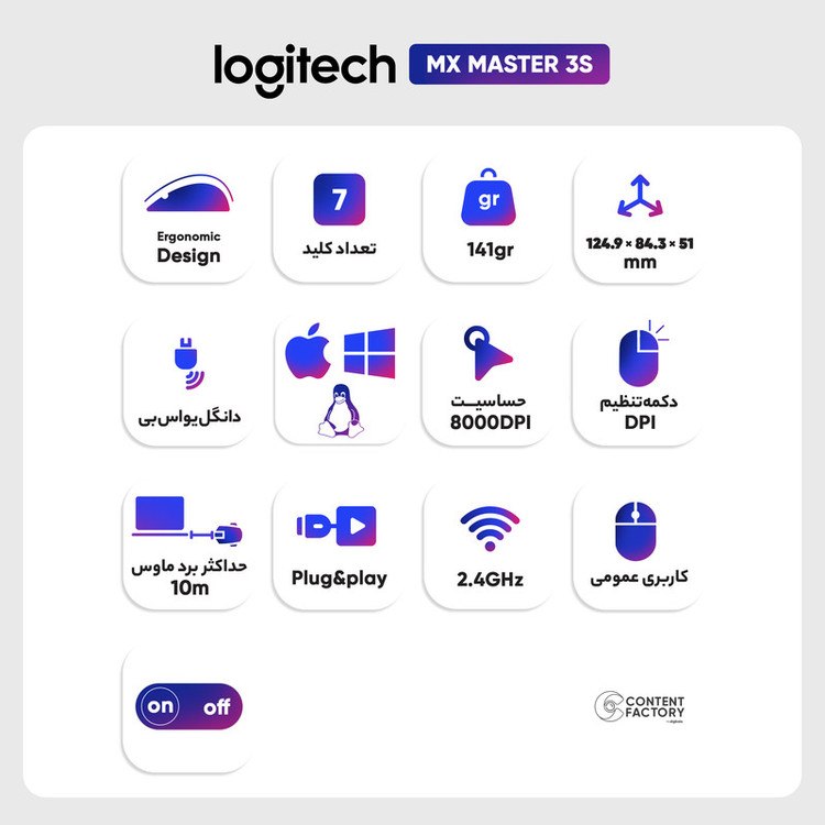 ماوس بی سیم لاجیتک مدل MX MASTER 3S بدون هیچ اغراقی یکی از بهترین و مناسبترین ماوسها برای افراد حرفهای به شمار میرود. برند Logitech یک برند مطرح سوئیسی است که در زمینه تولید انواع ابزارهای جانبی کامپیوتر فعالیت دارد. این ماوس از برند لاجیتک دقتی برابر با 8000 DPI دارد که برای یک ماوس غیرگیمینگ فوقالعاده است. شما با یک دقیقه شارژ میتوانید 3 ساعت و با 3 ساعت شارژ میتوانید 70 روز از این ماوس استفاده کنید. همچنین ماوس مذکور را میتوانید هم از طریق بلوتوث و هم از طریق دانگل به دستگاه خود وصل کنید. دانگل logi Bolt میتواند برای شما امکان اتصال همزمان این ماوس را به 3 دستگاه فراهم کند. طراحی خاص این ماوس میتواند مانع از خستگی دست کاربر برای زمانی طولانی شود. دو اسکرول مجزا، دو دکمه Backward و Forward و در کل 7 دکمه قابل تنظیم با نرمافزار Logi Options دارد. بُرد این ماوس در حدود 10 متر است. این ماوس را میتوانید بر روی تمامی سطوح از جمله شیشه و فرش هم استفاده کنید. کلیکهای این ماوس بیصدا هستند. وزن بیشتری نسبت به ماوسهای معمولی دارد و به همین دلیل قابلیت کنترل بیشتری به کاربر میدهد. یکی از جذابیتهای استفاده از ماوس MX MASTER 3S این است که میتوانید با اتصال سه دستگاه مختلف مثل لپتاپ، تبلت و گوشی از طریق دانگل به راحتی تنها با یک درگ ساده، فایلها را بین این دستگاهها جابهجا کنید. این ماوس یکی از بهترین انتخابها برای افرادی است که کار تدوین، برنامهنویسی یا طراحی انجام میدهند.