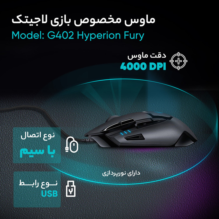 ماوسها ، یکی از قدیمیترین ابزارها ی کنترل کامپیوترها ی شخصی هستند که بدون وجود آنها ، تجربهی کاربری شیرین و لذتبخش کامیپوتر برای خیلی از افراد به عذابی دردناک تبدیل میشود. تصور کنید مرور صفحات اینترنتی بدون در اختیار داشتن ماوس تا چه اندازه غیر قابل تحمل خواهد بود. ماوسها ی کامپیوتر با وجود اینکه بیش از 50 سال از عمرشان میگذرد، هنوز هم از همان فرم ساختاری ماوسها ی اولیه بهره میبرند. شاید آقای داگلاس انگلبارت (Douglas Engelbart) در زمان اختراع اولین ماوس، کارش را آنقدر خوب انجام دادهبود که دیگر کسی نمیتوانست بهتر از او این کار را انجام دهد یا حداقل آن را بهبود بخشد. ماوسها ی کامپیوتر برای مصارف گوناگونی مورد استفاده قرار میگیرند: کاربردها ی صنعتی، مهندسی، آموزشی، انجام کارها ی اداری، برای بازی و ... چیزی که در این بین و در تمام کاربردها مشترک است، نیاز به وجود این ابزار کوچک و ضروری است. ماوس G402 ها یپریون فیوری، محصول شرکت لاجیتک (Logitech) است که از طریق کابلی 2.1 متری و از طریق پورت USB به کامپیوتر وصل میشود. حسگر ماوس G402 ها یپریون فیوری از نوع اپتیکال (نوری) بوده و دارای دقت 4000 دیپیآی (DPI) است که دقیقا برای بازیکردن با کامپیوتر ساخته شدهاست. ماوس G402 ها یپریون فیوری در رنگ مشکی ارایه شدهاست که کاملا با سلیقه بازیبازها (Gamer) سازگار است. بدنهی ماوس به گونهای است که خمیدگیها و پیچشها ی گاه تند و گاه نرماش، توجه هر بازیبازی را به خود جلب میکند. استفاده از پلاستیک مشکیرنگِ مات و براق و ترکیب آن با نورها ی آبی کار شده در بدنه، نمایی استثنایی به G402 ها یپریون فیوری دادهاست. این ماوس از اکثر نسخهها ی سیستم عامل ویندوز (Windows) و مک (Mac) پشتیبانی میکند و میتوان با خیال راحت، مدتها با آن کار کرد. طراحی شیک، دقت بالا، امکان تغییر سریع دقت DPI و برنامهپذیر بودن کلیدها از ویژگیها ی مثبت این ماوس است.
