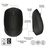 «M171» یک ماوس بیسیم است که از طریق فناوری وایرلس به دستگاه موردنظرتان متصل میشود. این محصول میتواند تا فاصلهی 10 متری به شما خدمت کرده و شما را از شر سیمهای اضافی نجات دهد. این ماوس بیسیم بسیار خوشدست است و از طراحی بسیار خوبی بهره میبرد؛ بهصورتیکه دستتان کاملا راحت و طبیعی روی آن قرار میگیرد و حتی پس از ساعتها کار طولانی با آن خسته نخواهد شد. این ماوس به دلیل ابعاد و طراحی هوشمندانهاش، قابلیت استفاده به وسیلهی دو دست را فراهم کرده است. ارتباط ماوس با رایانه به وسیلهی دانگل USB انجام میشود. فرکانس 2.4 گیگاهرتز و برد ماوس 10 متری برای M171 یک مزیت بوده و دست شما را برای ارتباط بدون محدودیت باز گذاشته است. باتری موردنیاز برای این ماوس از نوع نیمقلمی است. در قسمت زیرین این ماوس، دکمهای برای خاموش و روشنکردن آن وجود دارد که به صرفهجویی در مصرف انرژی کمک شایانی میکند. «لاجیتک» برای انتخاب راحتتر، M171 را در سه رنگ تولید کرده است. این محصول شباهت زیادی به محصول M171 دارد و در بخش طراحی بدنه و رنگهای عرضهشده، متفاوت است.