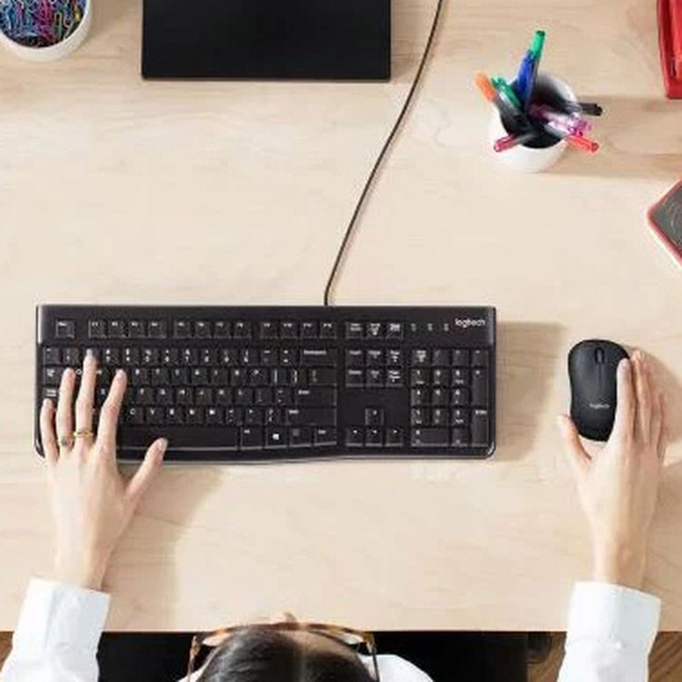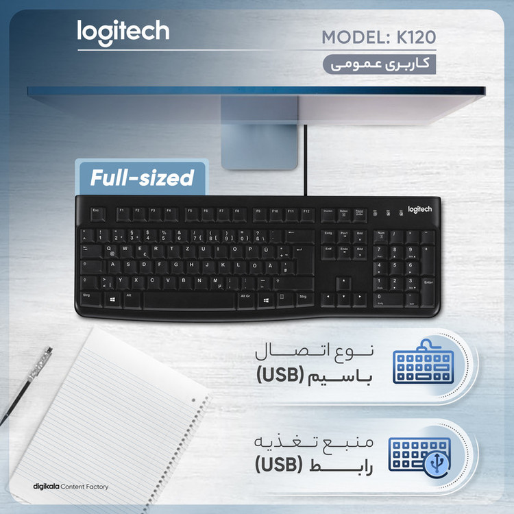 طراحی، تولید و به بازار عرضه کرده است. حروف، اعداد و علامتهایی که روی کلیدهای کیبورد K120 حک شدهاند، کاملا بزرگ و شفاف هستند تا به راحتی قابل خواندن باشند و نیازی به دقت زیاد در هنگام استفاده از آن نباشد. این کیبورد با دو نوع حروف در دسترس قرار دارد، مدل اول فقط دارای حروف انگلیسی بوده و مدل دوم علاوه بر حروف انگلیسی از حروف عربی حک شده هم بهره میبرد (همین محصول). این کیبورد باسیم، کاملا ساده و کاربردی طراحی شده و به دلیل بهرهبری از کلیدهای استاندارد و بسیار نرمی که به ندرت صدایی از خود ایجاد میکنند، قابلیت یک تایپ بسیار نرم، روان و تقریبا بیصدا را برای شما به ارمغان میآورد. یکی از ویژگیهای کیبورد K120 مقاوم بودن آن در برابر نفوذ مایعات است. البته این کیبورد و کیبوردهایی شبیه به آن که در برابر نفوذ مایعات مقاوم هستند، ضد آب نیستند و به این معنی نیست که شما میتوانید زیر آب با آن کار کنید، چون مطمئن باشید که خراب میشوند. ولی اگر در حالت کار کردن با این کیبورد به صورت تصادفی مایعی روی کیبورد ریخت، زیاد نگران نباشید زیرا پس از پشت و رو کردن کیبورد و خارج کردن مایع ریخته شده، میتوانید دوباره به کار خود ادامه دهید. این کیورد دارای پایههای خم شونده است که قابل تنظیم ارتفاع را به شما میدهند. بنابراین شما میتوانید به دو صورت کاملا خوابیده یا به صورتی که قسمت پشت آن توسط پایهها کمی بلند شده، کار کنید. لاجیتک این کیبورد را با ابعاد استاندارد و مناسبی طراحی کرده تا فضای زیادی از میز شما را اشغال نکند. نصب و استفاده از کیبورد K120 لاجیتک بسیار ساده و آسان است و نیاز به نصب هیچ درایور یا نرمافزار خاصی ندارد. برای کار کردن با آن فقط کافیست که کیبورد را به پورت USB دستگاه خود متصل نموده و شروع به استفاده نمایید. درکل میتوان گفت که K120 یک کیبورد ساده اما کاربردی با کلیدهای نرم و تقریبا بیصدا است که در مقابل نفوذ مایعات مقاوم بوده و از طریق پورت USB و به صورت باسیم به دستگاه مورد نظر شما متصل میگردد. درضمن حروف و علائمی که روی کلیدهایش حک شدهاند کاملا بزرگ و شفاف هستند. بنابراین کیبورد K120 لاجیتک برای افرادی که به یک کیبورد ساده و بادوام برای استفاده در منزل یا اداره نیاز دارند، بسیار مناسب است.
