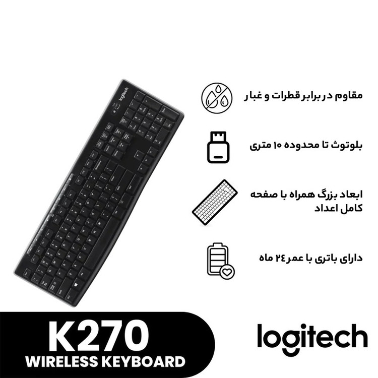 K270 توسط کمپانی مشهور لاجیتک که محصولات متنوعی را در زمینه لوازم جانبی کامپیوتر مانند کیبورد، ماوس، وبکم، هدفون، هدست، انواع ابزارهای بازی و... را تولید میکند، طراحی شده است. این محصول با قابلیت اتصال به صورت بیسیم این امکان را به شما میدهد تا در هر کجا که هستید (البته تا فاصله 10 متری) با آن کار کنید، مثلاً در هر حالتی که راحت هستید بر روی مبل بنشینید و با این کیبورد کار کنید. فرکانس 2.4 گیگاهرتزی K270 تأخیرها و تداخلها را از بین میبرد و شما بدون هیچ مشکی میتوانید به کارهای خود بپردازید. گیرنده USB این محصول نیز بسیار کوچک طراحی شده، به صورتی که شما میتوانید بدون هیچگونه مزاحمتی آن را بر روی پورت USB لپتاپ یا کامپیوتر خود بگذارید بماند.کیبورد این محصول انرژی مورد نیاز خود را از 2 عدد باتری آلکالاین سایز AAA تامین میکند که این دو باتری قادرند تا 24 ماه شارژدهی کنند. بنابراین شما میتوانید ماهها بدون دردسر تعویض باتری از این کیبورد استفاده کنید و نگران تمام شدن یا تعویض زود هنگام باتریها نباشید. صفحهکلید K270 دارای هشت عدد کلید میانبر است که اعمالی مثل پخش/مکث، قطع کردن صدا، کم و زیاد کردن حجم صدا، اینترنت، ایمیل، خاموش کردن کامپیوتر یا لپتاپ و باز کردن ماشین حساب را برای شما امکانپذبر میسازند. درکل میتوان گفت که K270 شامل یک کیبورد کارآمد است که به صورت بیسیم و از طریق دانگل USB به دستگاه مورد نظر شما متصل میشوند و برای افرادی که به یک کیبورد بیسیم، بادوام و با طراحی ساده برای استفاده در منزل یا اداره نیاز دارند، یک انتخاب بسیار مناسب و مقرون به صرفه است
